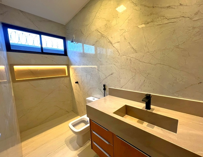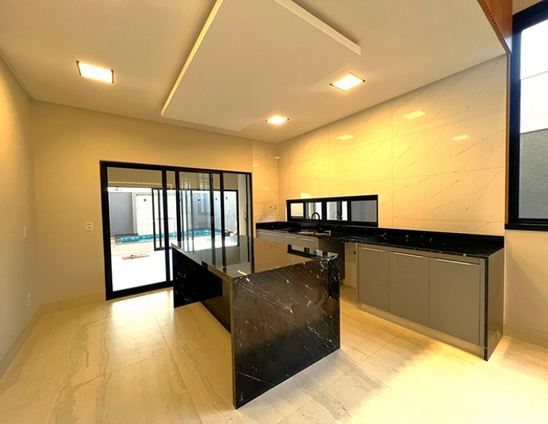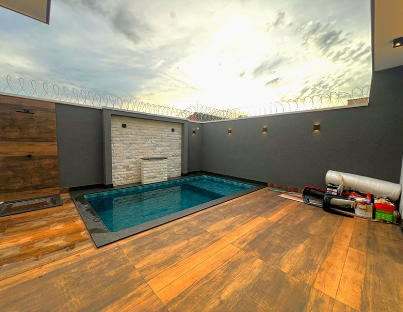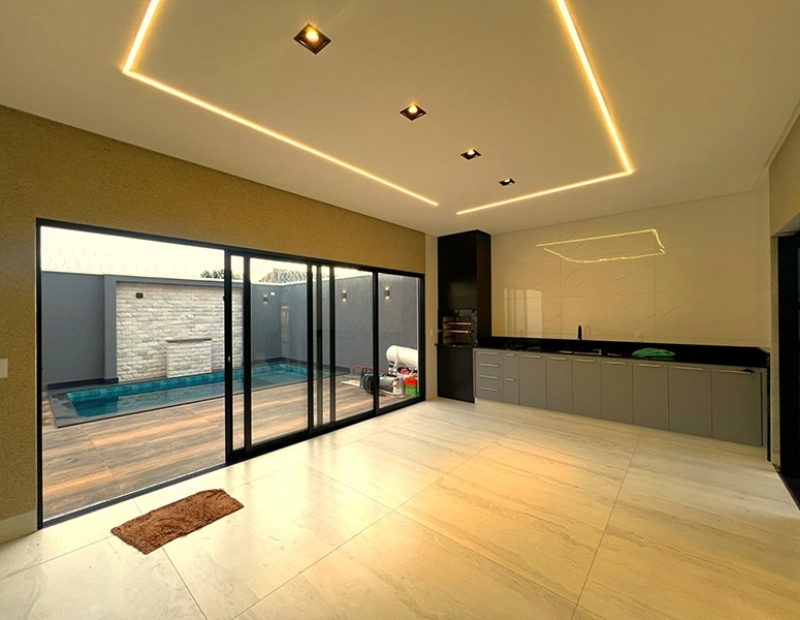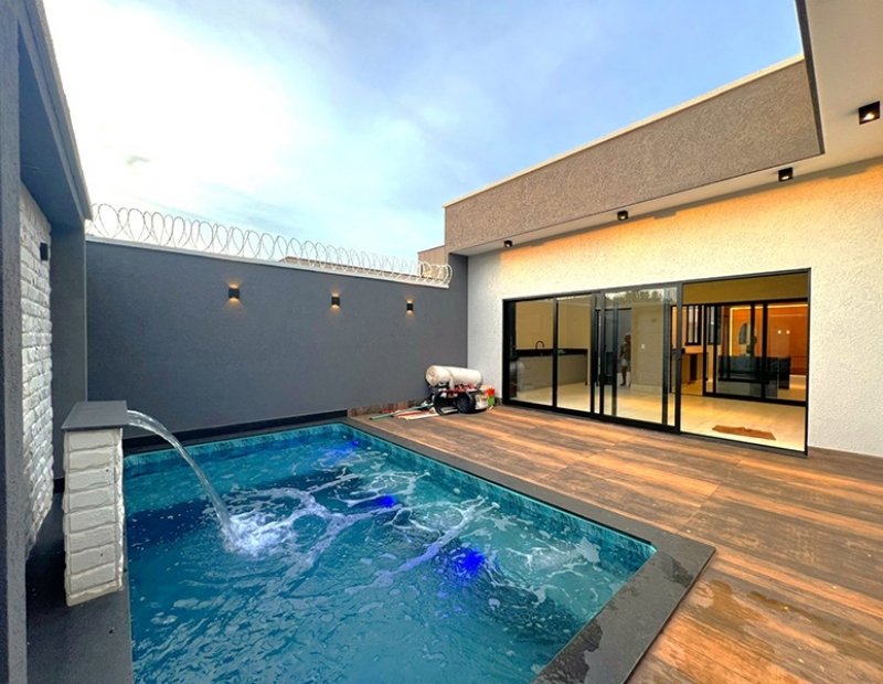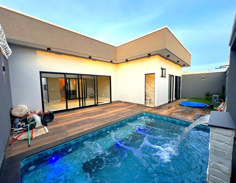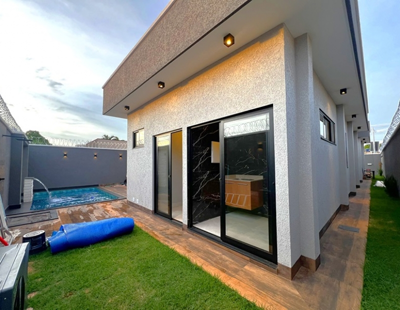 A casa à venda possuí 3 quartos sendo 3 suítes plenas (suíte principal com closet), lavabo, ampla sala com pé direito duplo já integrada com cozinha conceito aberto com ilha. Possuí uma área de lazer incrível composta por churrasqueira à carvão com bancada de apoio, piscina aquecida com hidro e cascata. Área de serviço isolada e depósito. Jardim frontal já gramado. A casa possuí 4 vagas de garagem sendo 2 cobertas. Já possuí armários planejados na cozinha, banheiros e varanda gourmet. A casa conta com geração de energia solar com 12 placas fotovoltaica gerando aproximadamente 1000w.