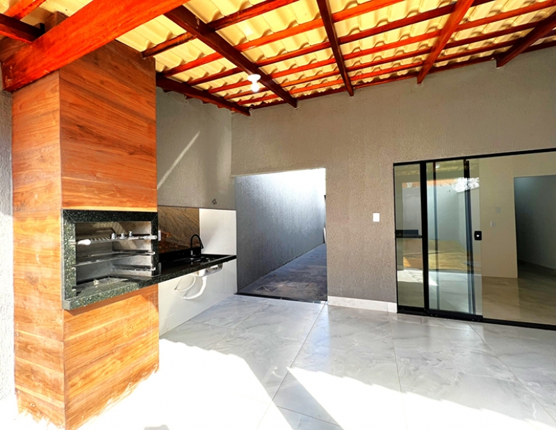 A casa à venda com 2 quartos sendo 1 suíte. Sala, cozinha integrada com varanda gourmet equipada com churrasqueira à carvão, pia de apoio e bancada em granito. Jardim frontal gramado, corredor de acesso lateral. Área de serviço coberta. Banheiro externo na varanda gourmet. 2 vagas de garagem (possibilidade para até 3 vagas de garagem).