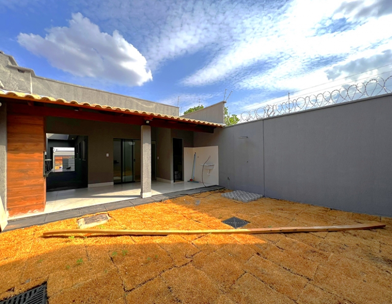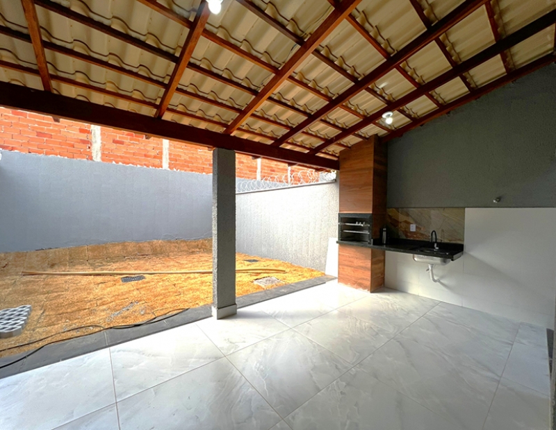 A casa à venda com 2 quartos sendo 1 suíte. Sala, cozinha integrada com varanda gourmet equipada com churrasqueira à carvão, pia de apoio e bancada em granito. Jardim frontal gramado, corredor de acesso lateral. Área de serviço coberta. Banheiro externo na varanda gourmet. 2 vagas de garagem (possibilidade para até 3 vagas de garagem).